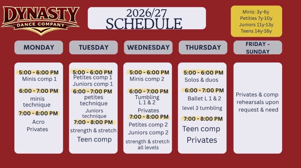 Dynasty Dance Company provides elite dance training for dancers ages 3–18 in a focused and motivating environment. Our studio emphasizes strong technical foundations while preparing dancers for competitive performance opportunities.